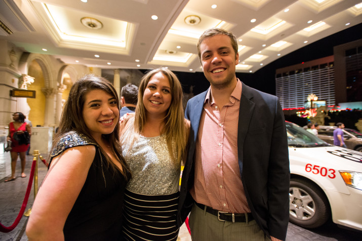 From left, Chapman 2012 graduate Morgan Horowitz, senior public relations and advertising major Rachel Tilghman and senior philosophy major Chris Joondeph enjoy a Tuesday night out on the strip in front of Caesar’s Palace. Photo by Adam Ottke.