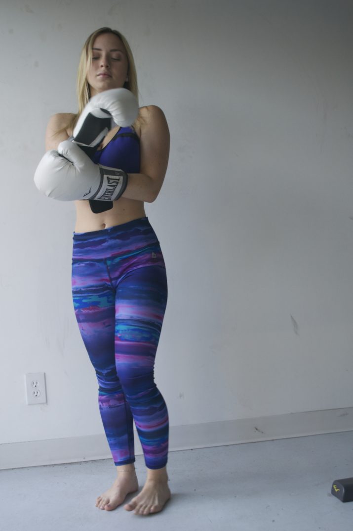 Junior creative writing major Danielle Shorr, adjusting her boxing gloves.