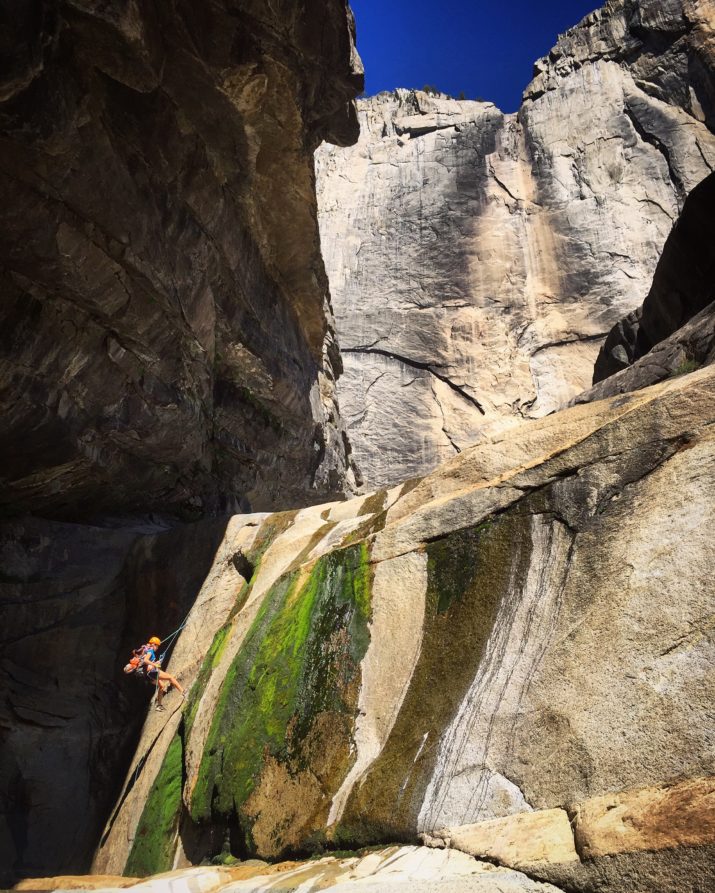 Doug Story 1 img-2 Katie Newburn, a Chapman alum, repels down a section of Yosemite Falls in Yosemite National Park, CA. Photo by Sam Baldridge.