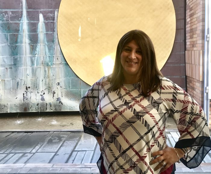 Kathryn photo Rabbi Corie Yutkin, Chapmanās first Director of Jewish Life, stands in front of the Fish Interfaith meditation fountain. Photo by Kathryn Bernhardt