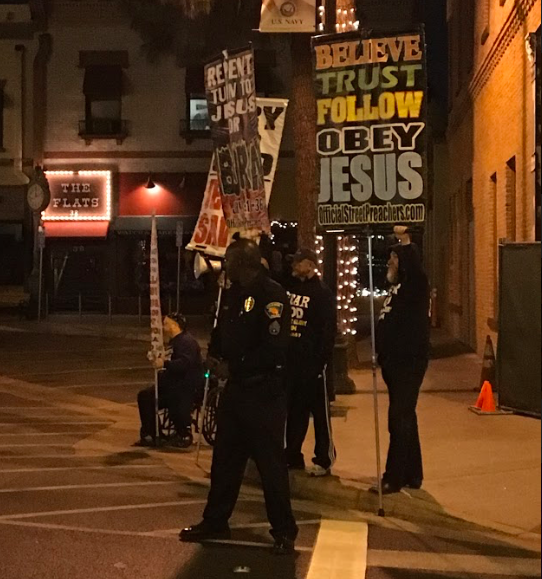 Screen Shot 2018-05-16 at 9.42.35 AM A group of bystanders protested last semester’s run with signs that told students to “obey Jesus”. Some students got in verbal arguments with the protestors | Photo by PEGGY WOOD